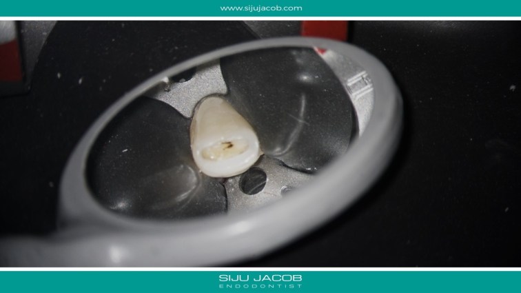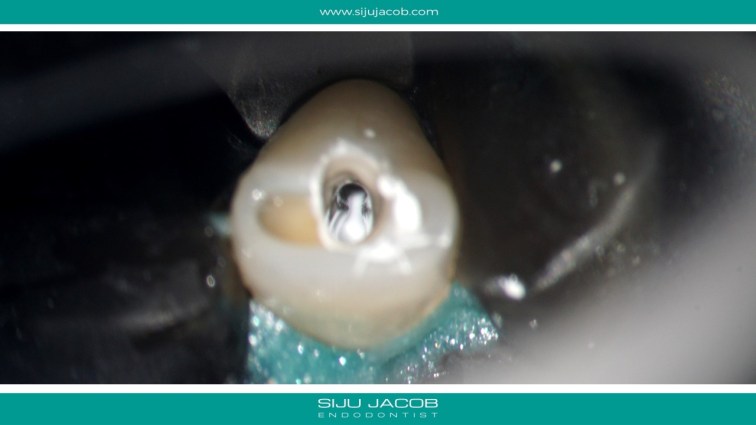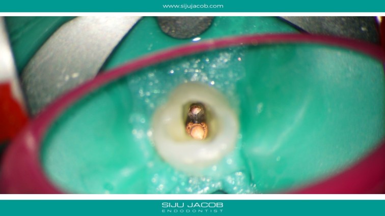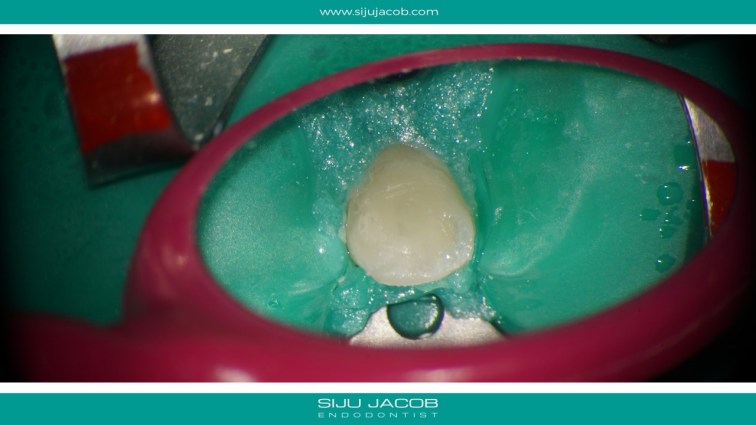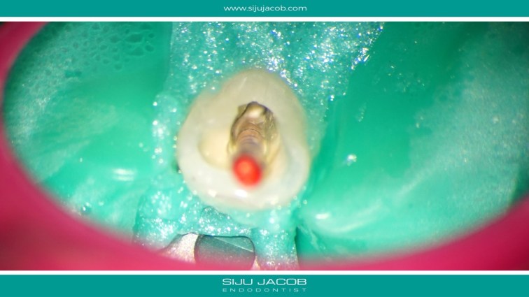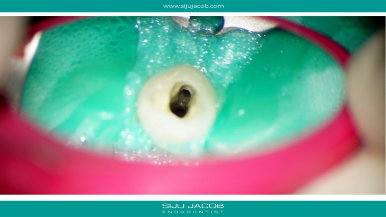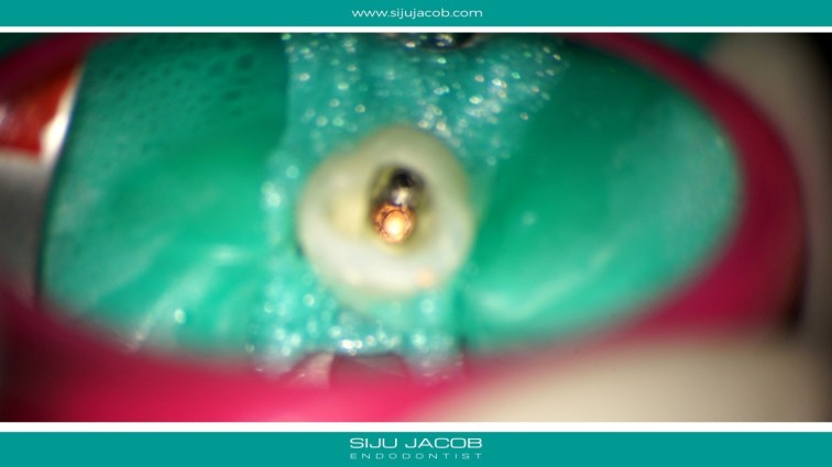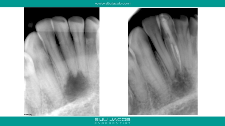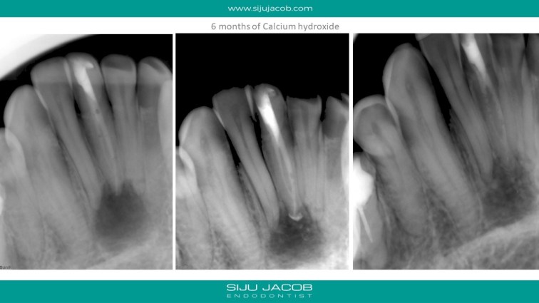 This patient had a lesion involving three teeth in the mandibular anterior region. He was seen by multiple clinicians and all of them had advised endo on 3 teeth followed by surgery. I treated just the one tooth which tested non-vital. I placed Long-term calcium hydroxide (6 months) to see some evidence of healing before obturation.