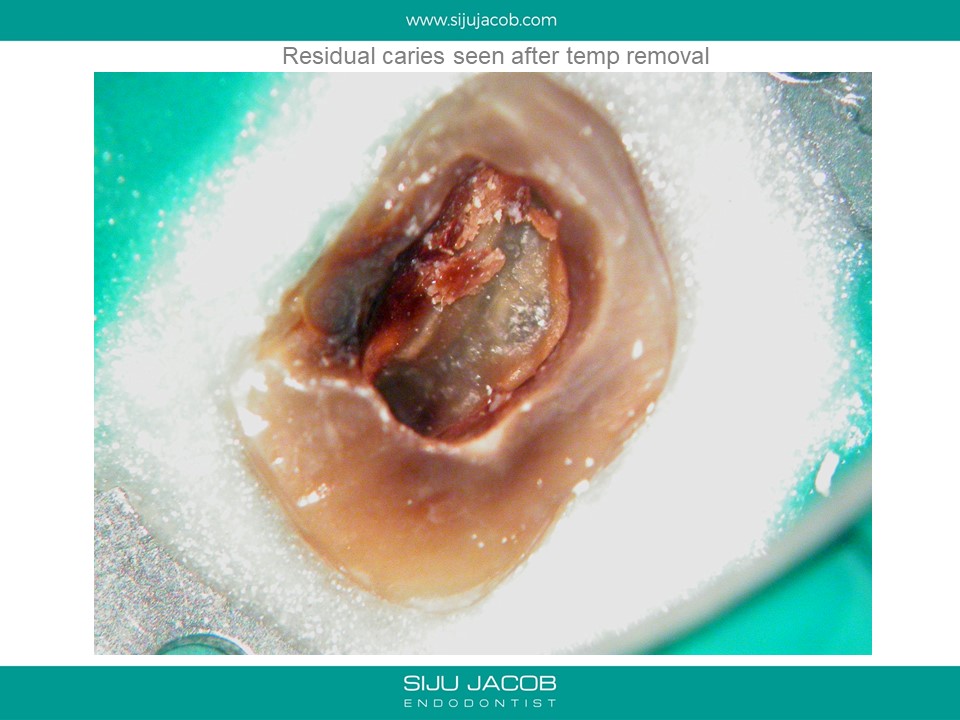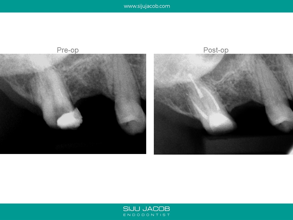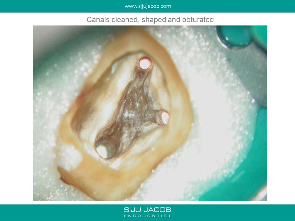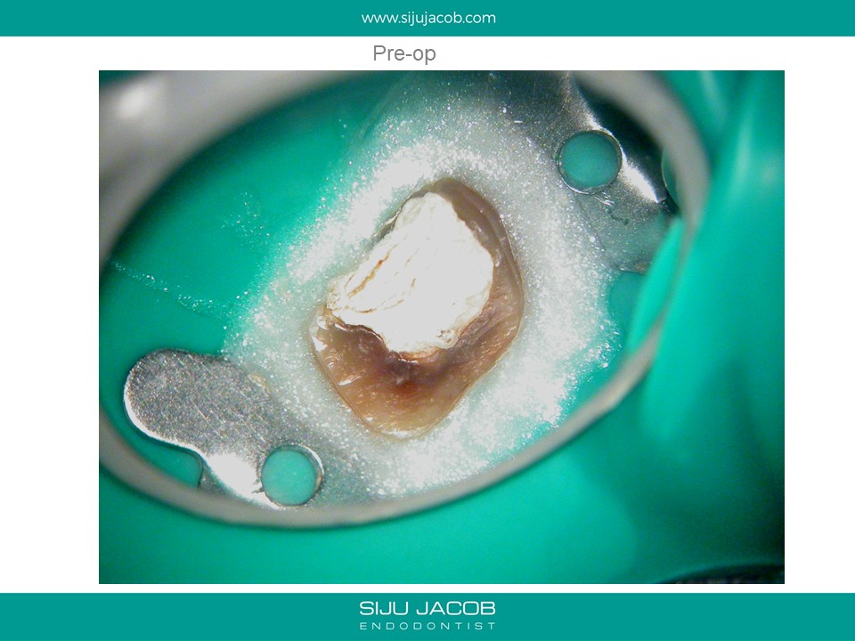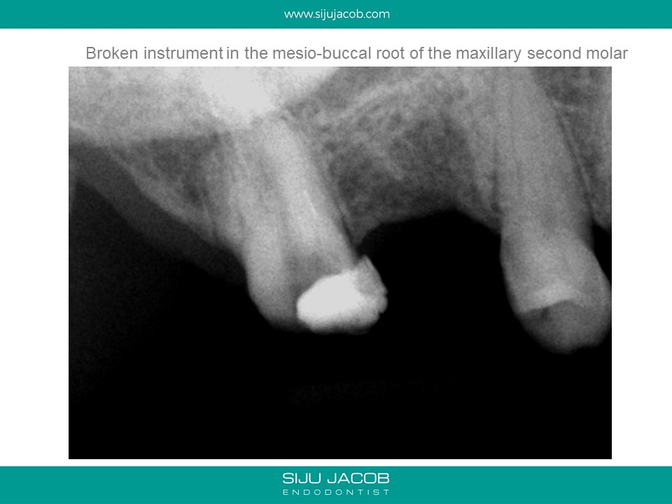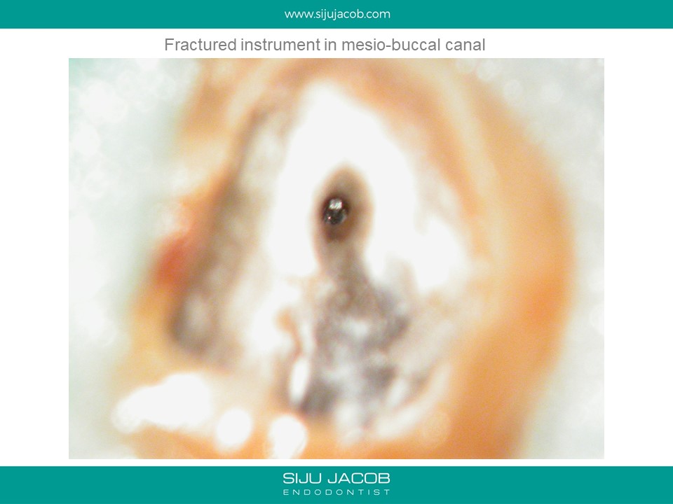 The previous practitioner fractured an instrument in the mesio-buccal root and referred this case. Instrument retrieval is usually fast and quite predictable in locations like the middle and coronal thirds.