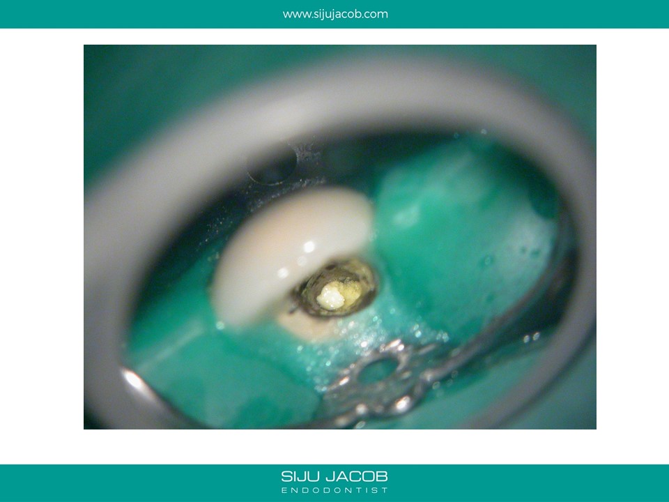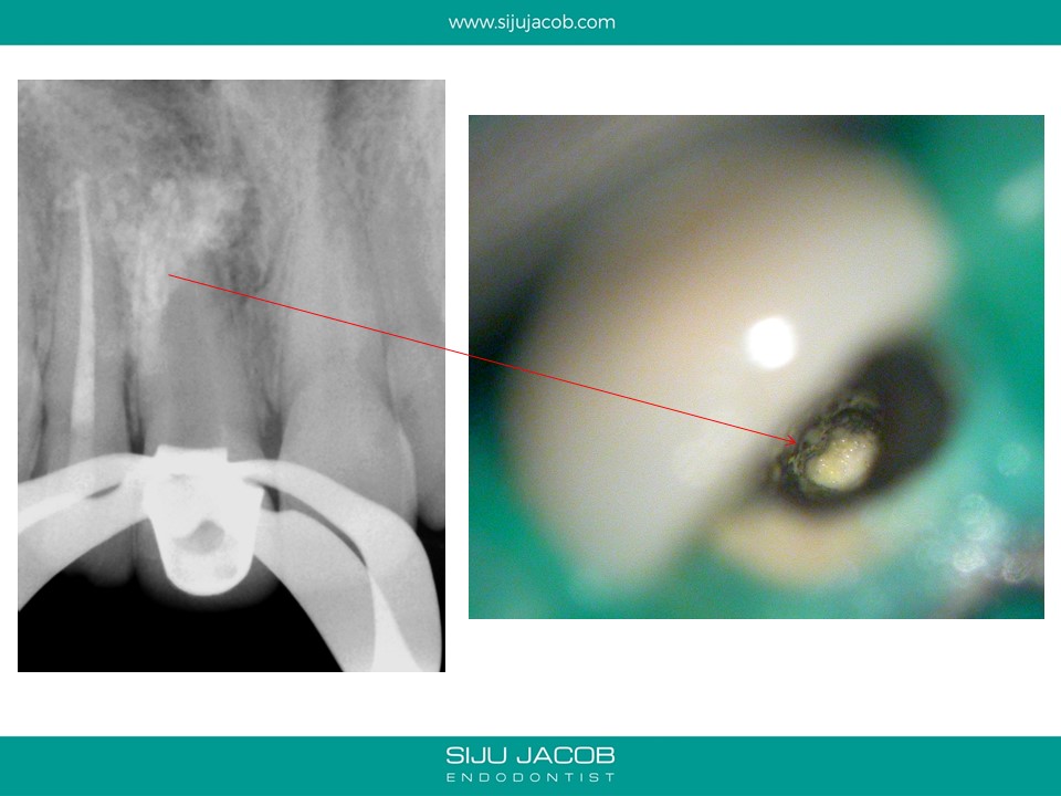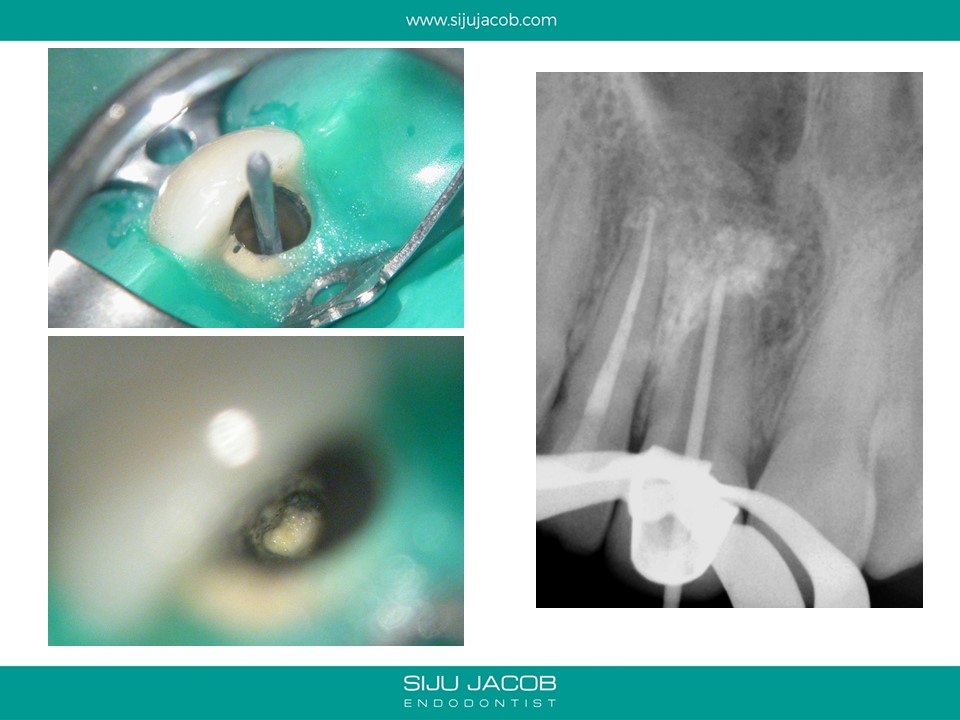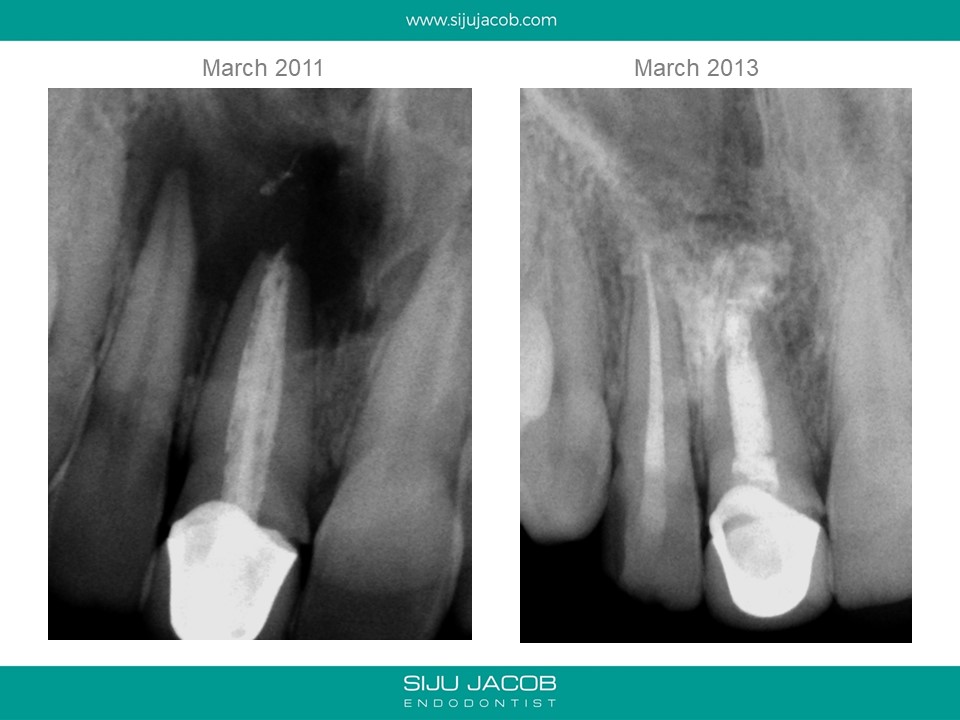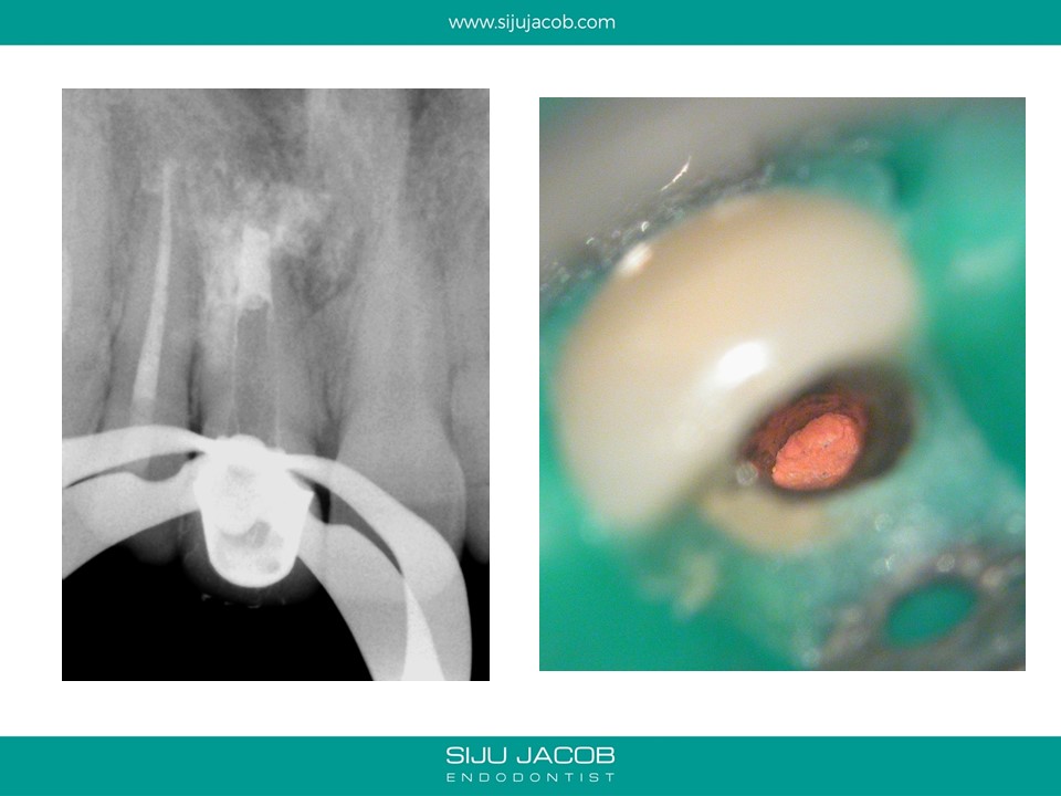 This patient presented with a large lesion associated with a previously endo treated central Incisor with a open apex. The adjacent lateral tested non-vital. I did Endo on the lateral incisor. In the central, I decided to pack Calcium hydroxide till the lesion shrank in size before obturating with MTA. The plan was to keep the original crown in place till there was some evidence of bone fill. The patient disappeared for two years and came back with the lesion completely healed and a solid barrier formed apically through Apexification. I obturated with Gutta percha (No MTA needed) and Advised new crown