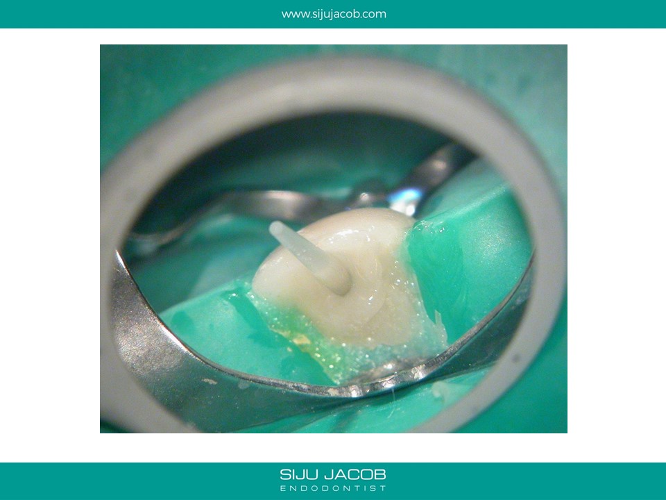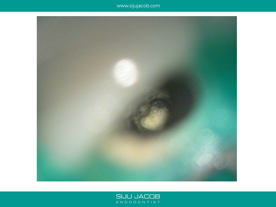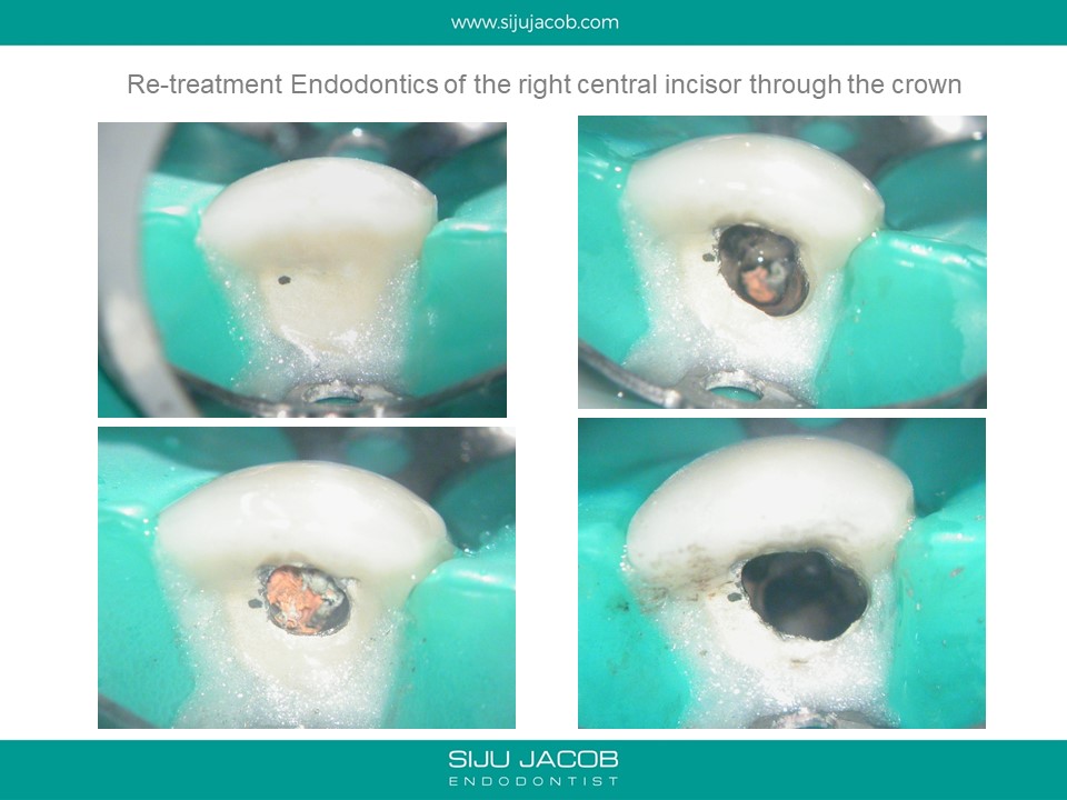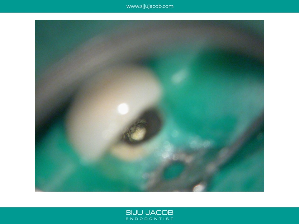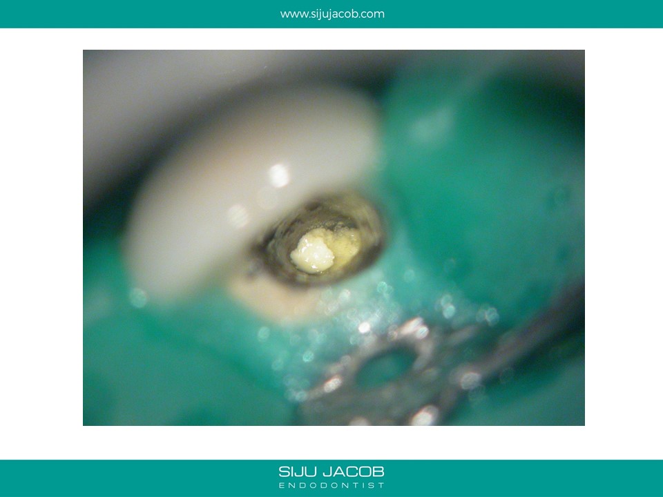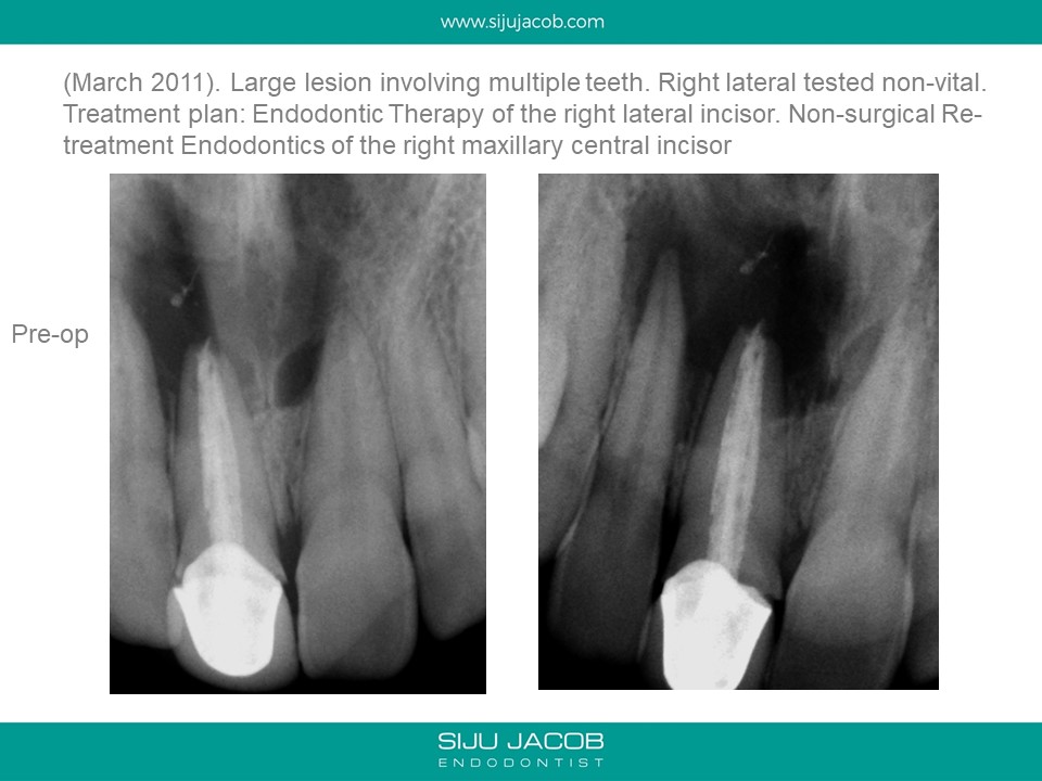 This patient presented with a large lesion associated with a previously endo treated central Incisor with a open apex. The adjacent lateral tested non-vital. I did Endo on the lateral incisor. In the central, I decided to pack Calcium hydroxide till the lesion shrank in size before obturating with MTA. The plan was to keep the original crown in place till there was some evidence of bone fill. The patient disappeared for two years and came back with the lesion completely healed and a solid barrier formed apically through Apexification. I obturated with Gutta percha (No MTA needed) and Advised new crown
