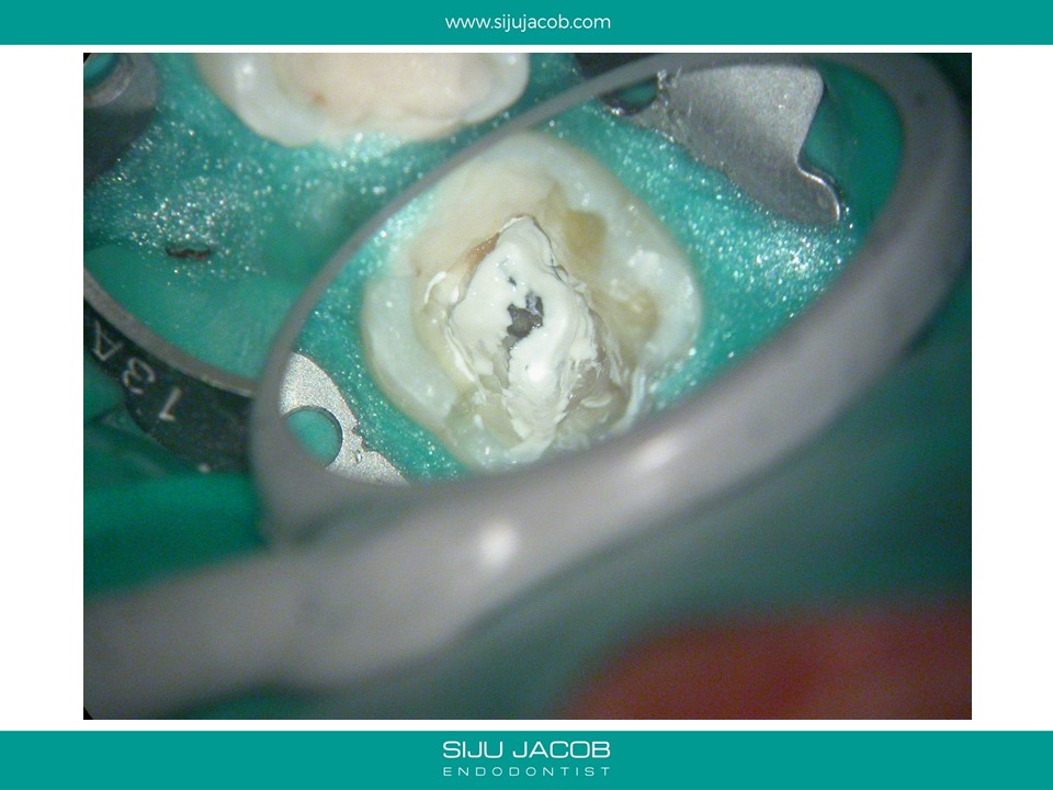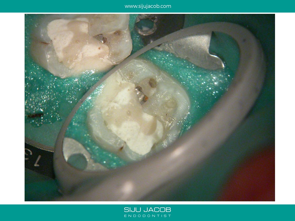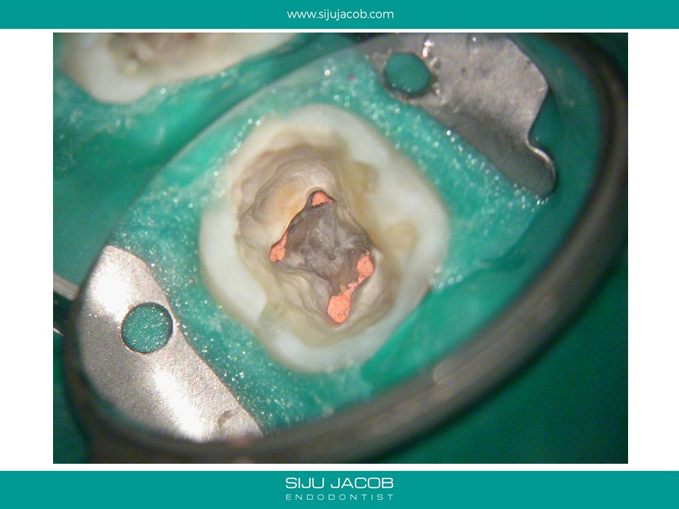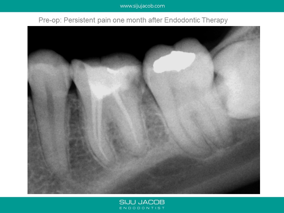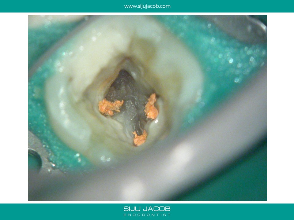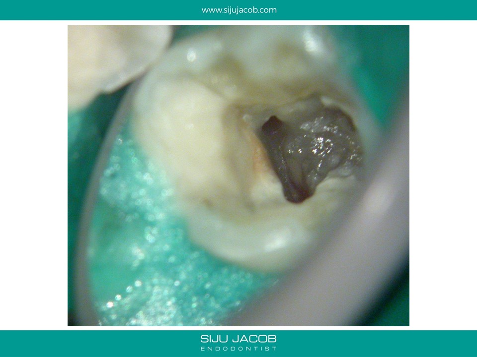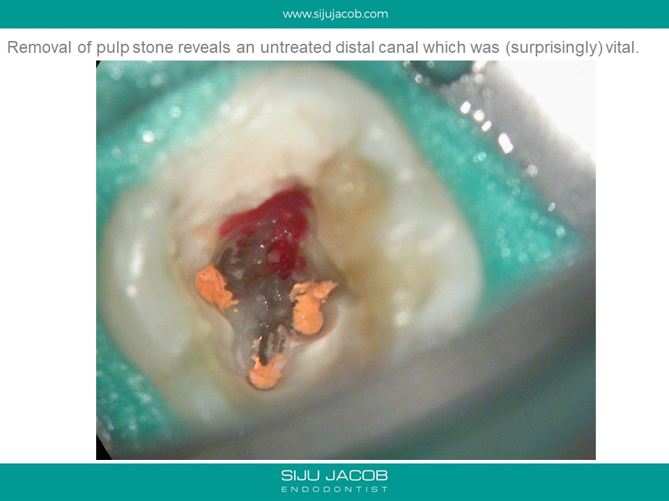 This patient had sensitivity to cold after an RCT on a lower molar. Sensitivity persisted even after a month. Re-treatment revealed a missed distal canal/root that was still vital and hyperaemic.