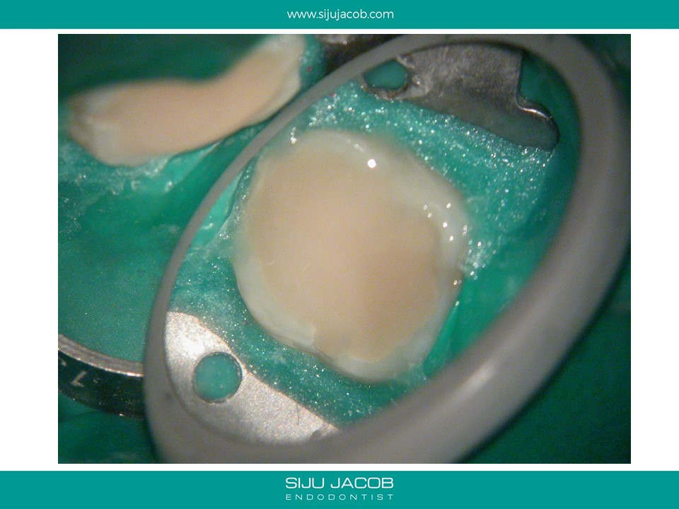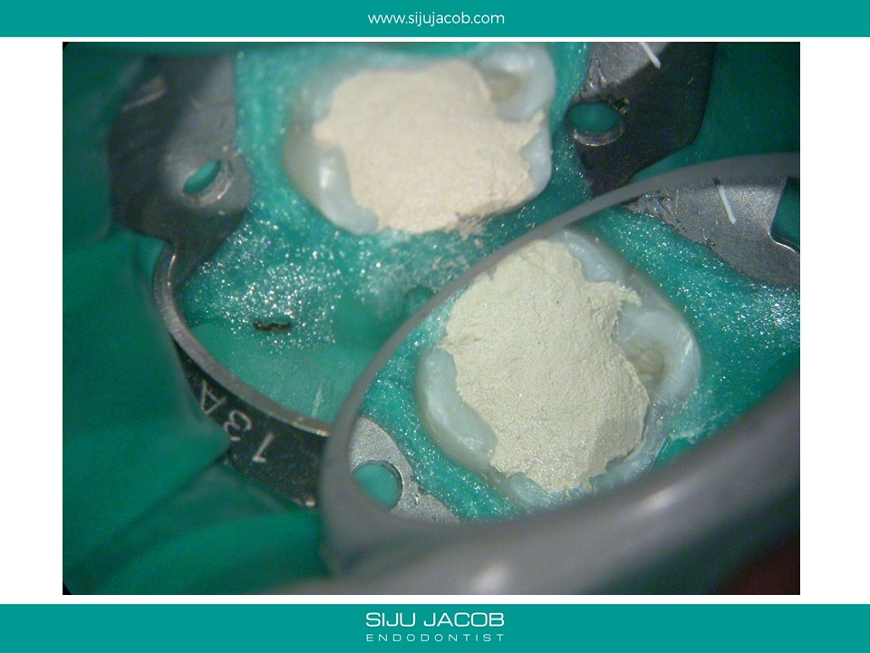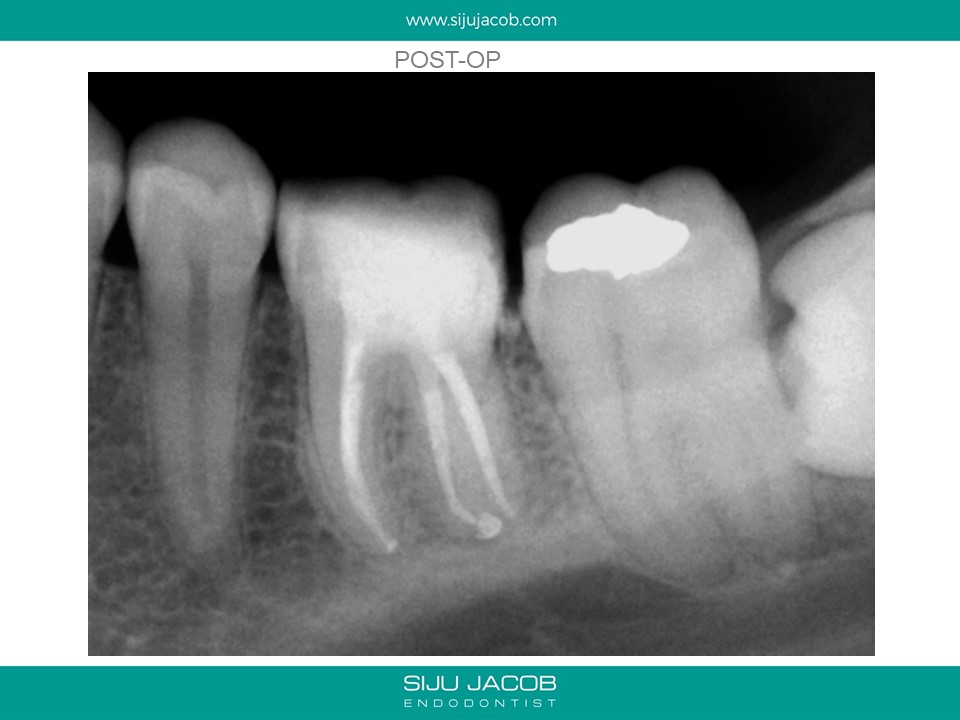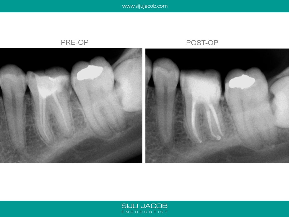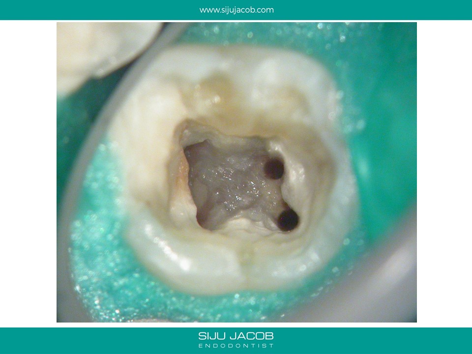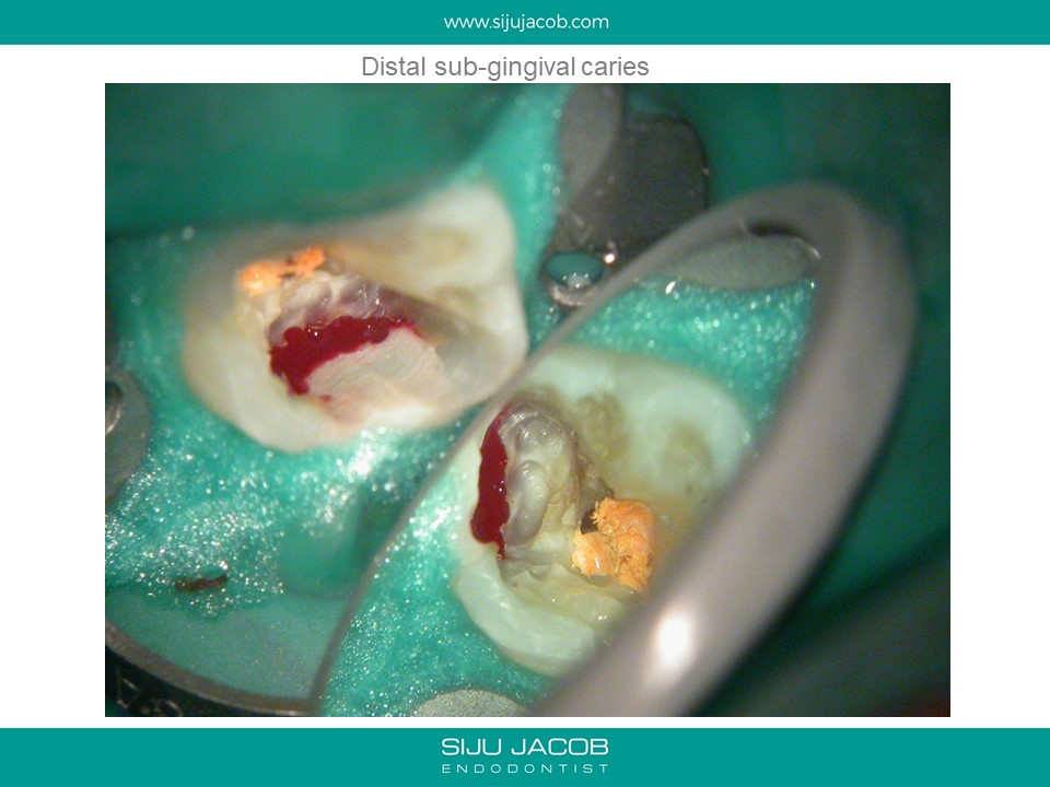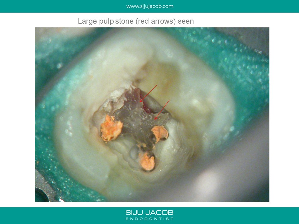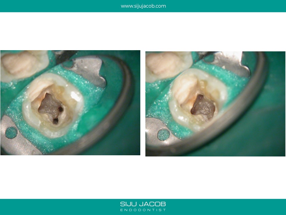 This patient had sensitivity to cold after an RCT on a lower molar. Sensitivity persisted even after a month. Re-treatment revealed a missed distal canal/root that was still vital and hyperaemic.