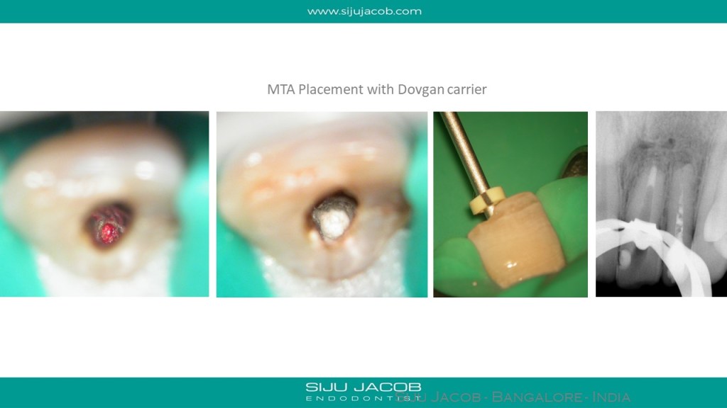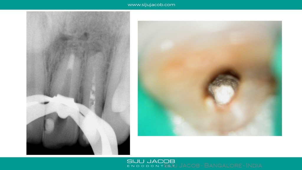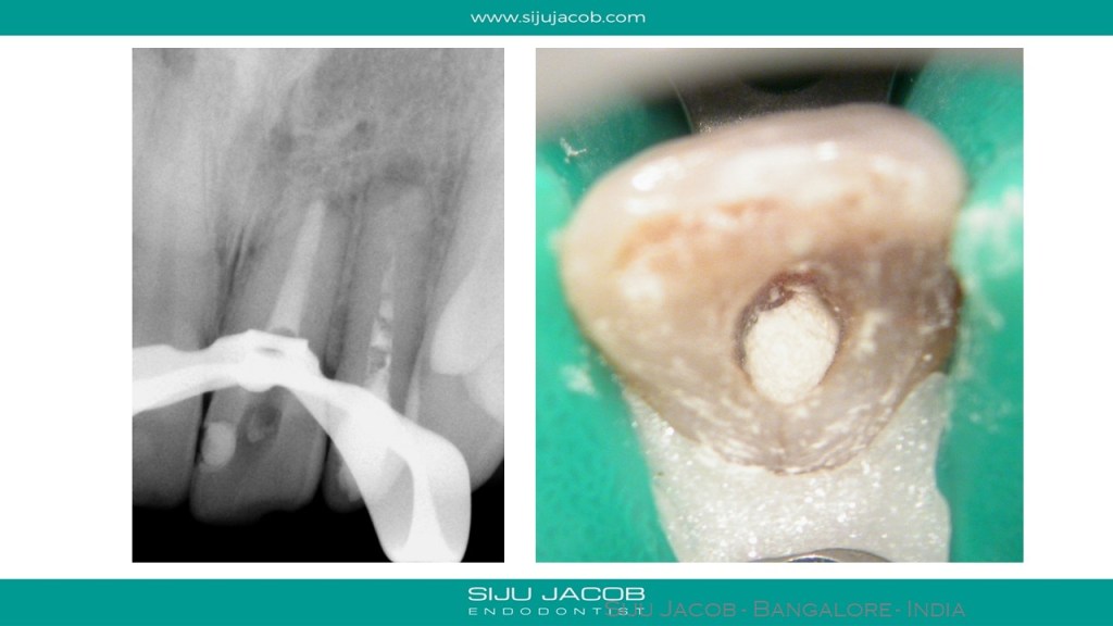 This patient had a history of RCT followed by surgery. While Re-treating, in the lateral incisor, i could get a cone-fit with a #45 master cone. The central however, had an open apex and was inflamed. I placed calcium hydroxide for 2 weeks and packed the central with MTA apically.