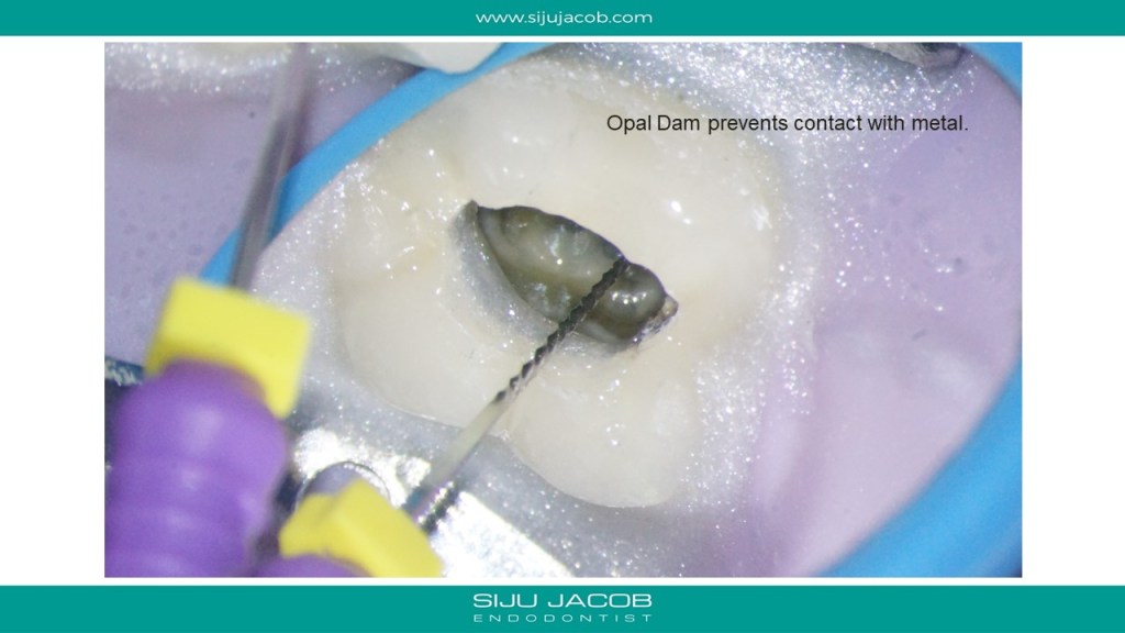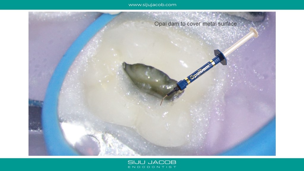 When Accessing through metal or Metal-ceramic crowns, the apex locator gives wrong readings if the file is in contact with the metal part of the crown. One way to prevent this is to block the metal margins of the access cavity with Opaldam.