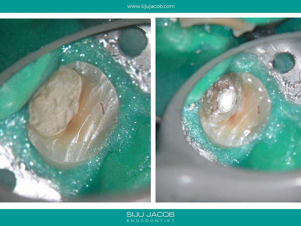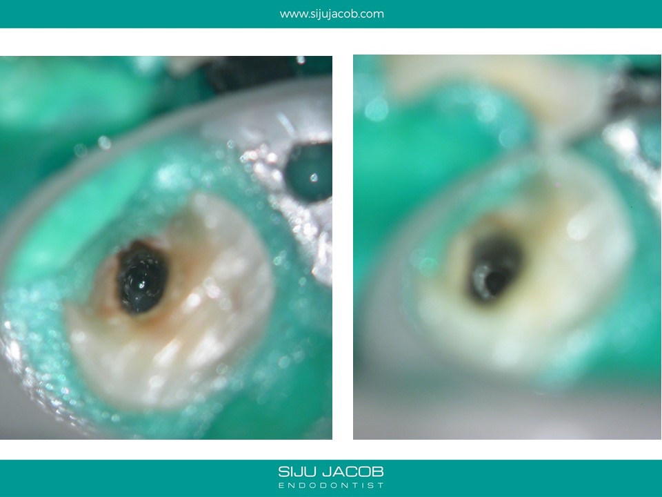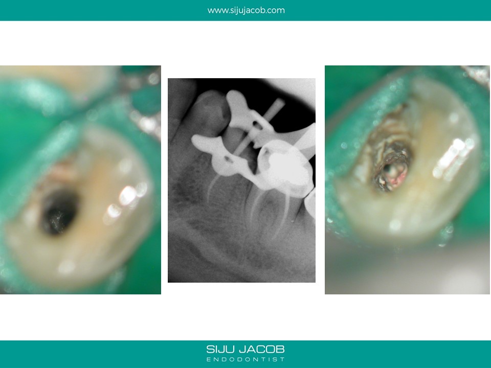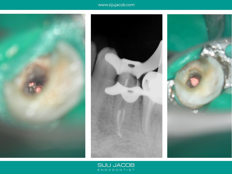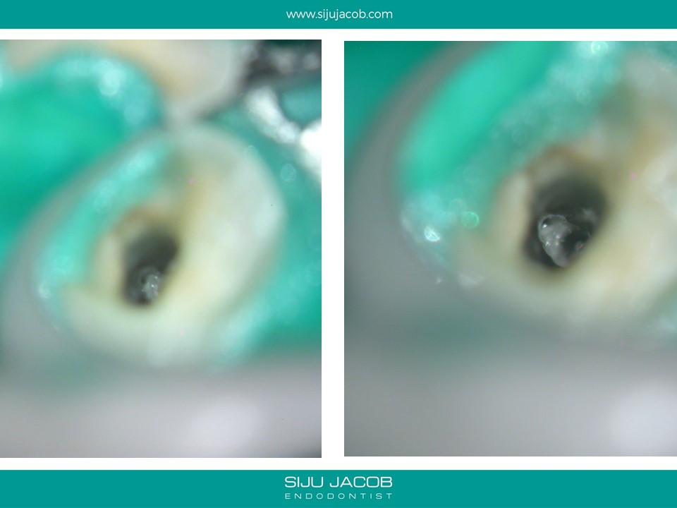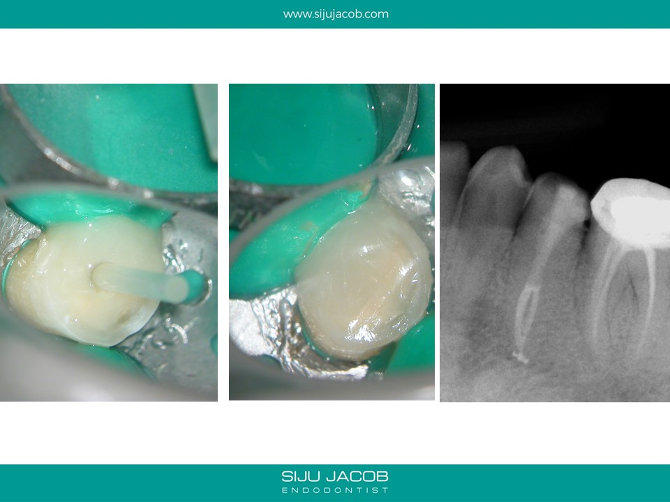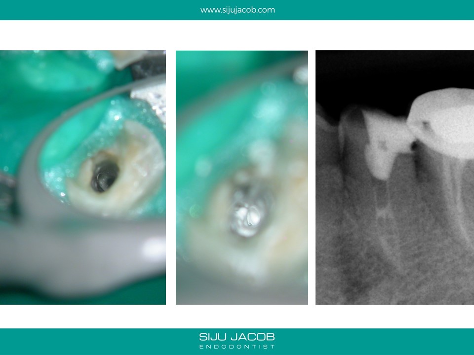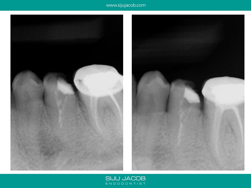 Previous clinician started this case and referred it when the patient continued to have pain. This was a two-rooted mandibular pre-molar with the canals present at a very odd angle and position. It was difficult to clean, shape and pack because the canals were very close to each other. When obturating these canals, I usually down pack one canal, then use a small micro-opener to remove the G.p that usually blocks the second canal and then down pack the second canal.