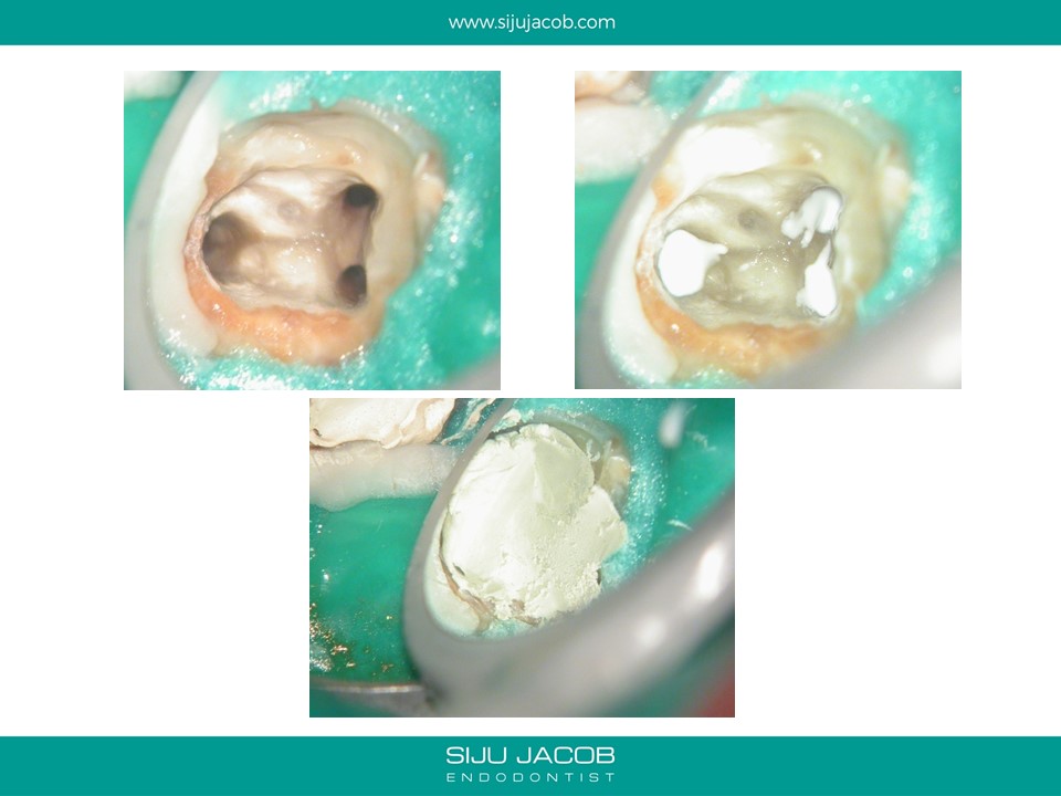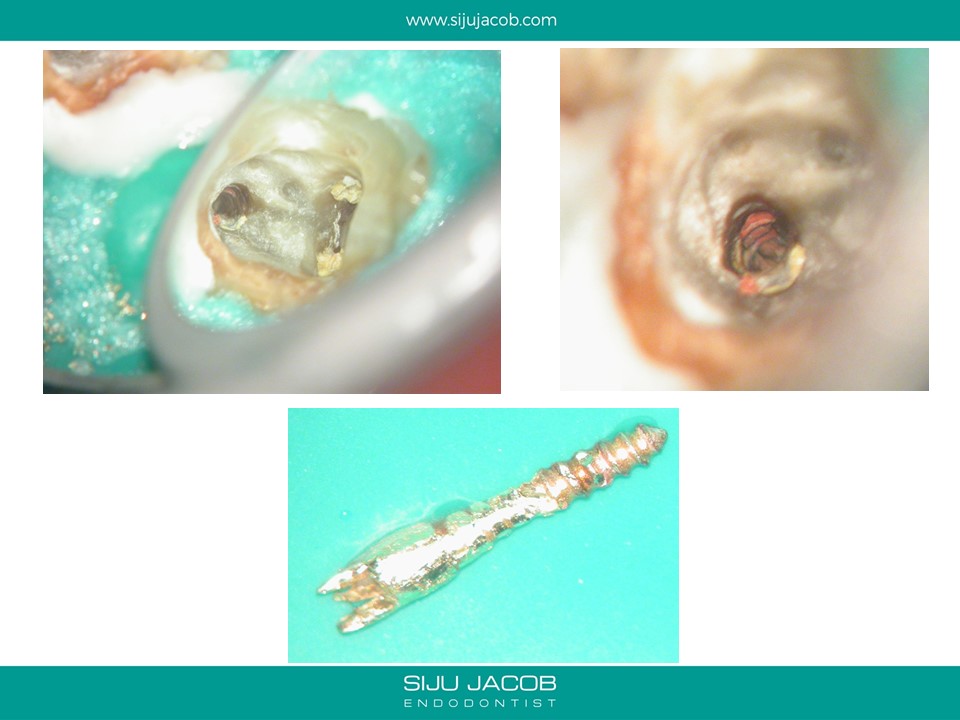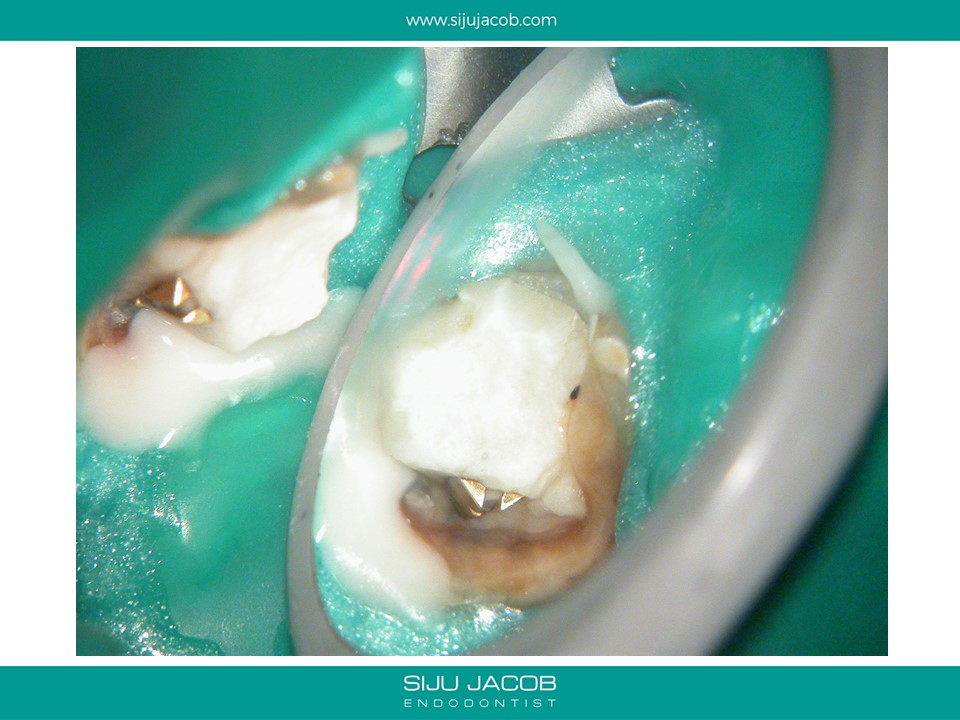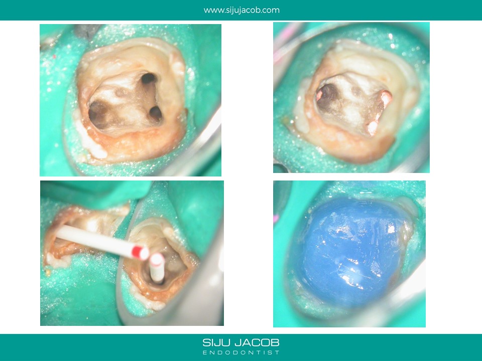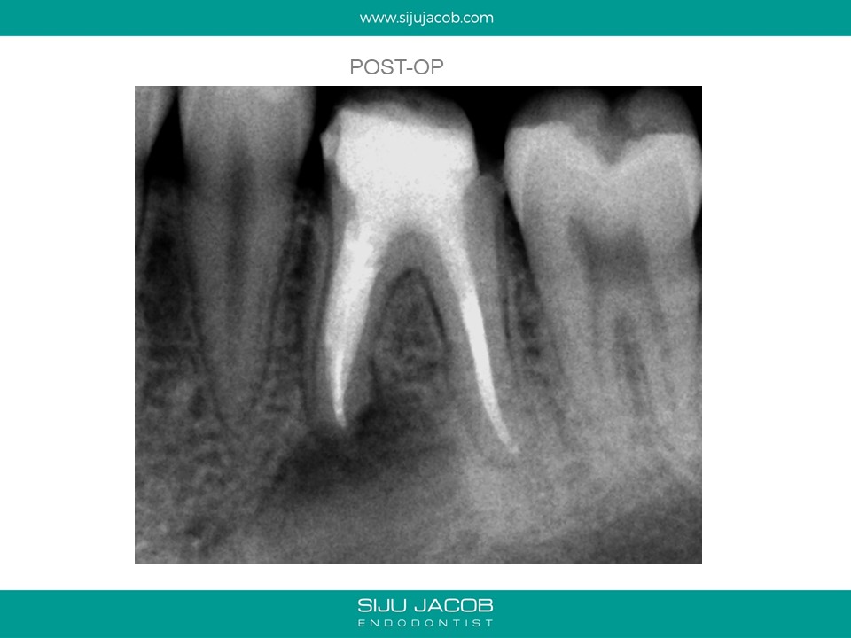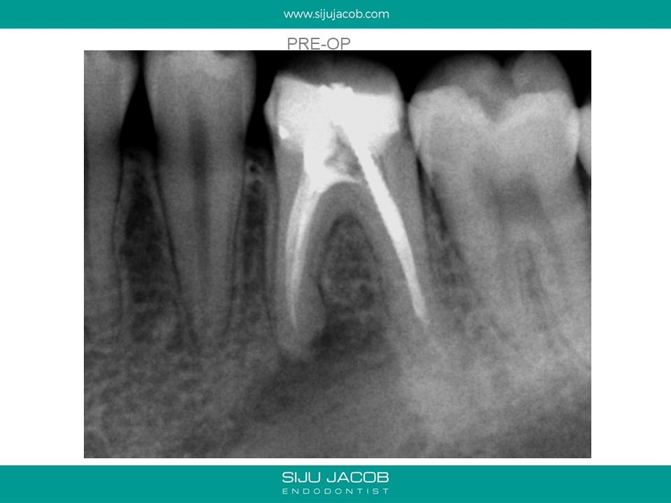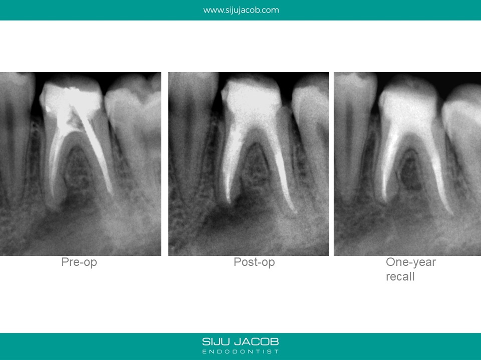 This is a case from 12 years ago. I re-treated all the canals including the distal which had a metal post. At, the one-year recall, the mesial root seems to have healed well. Today, I would probably have left the distal root alone and not over-enlarged those mesial canals.