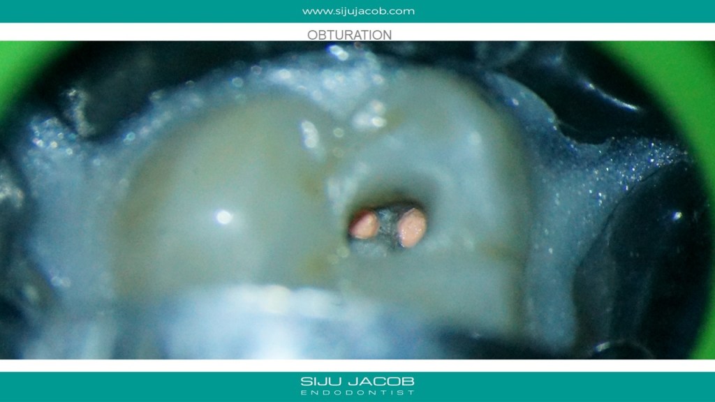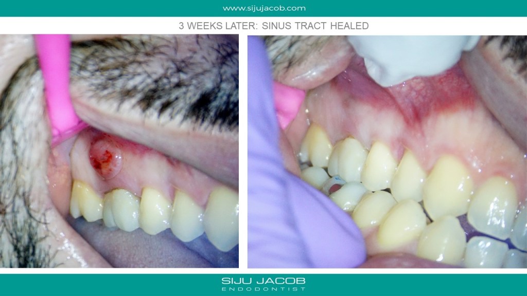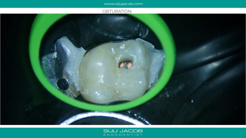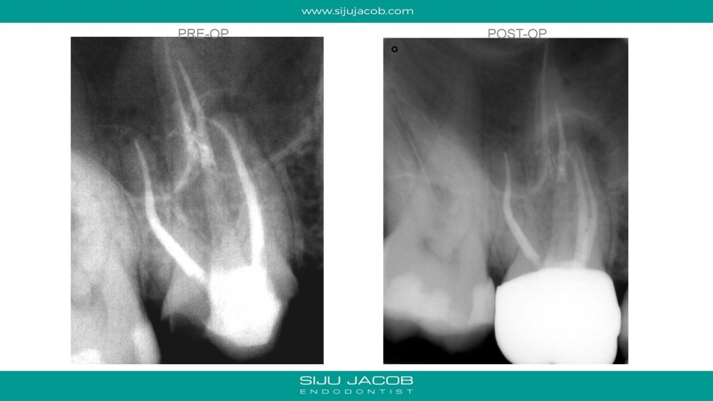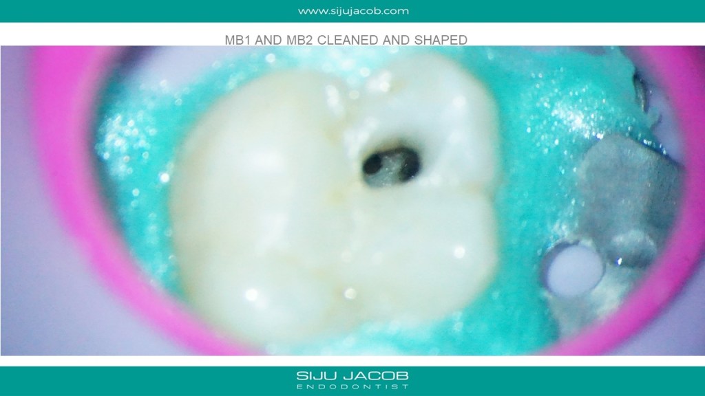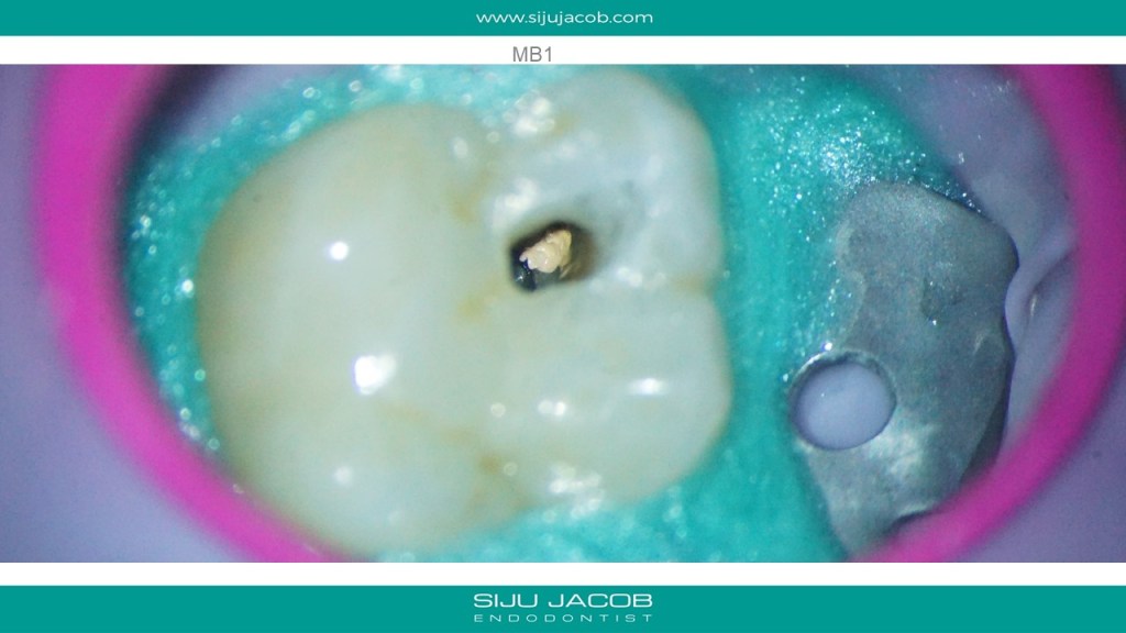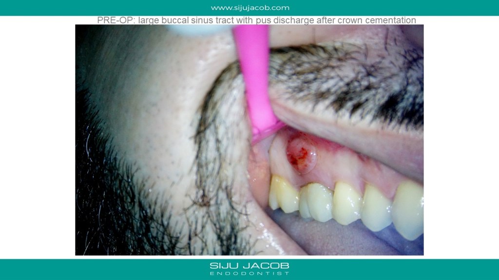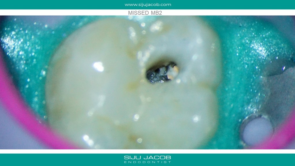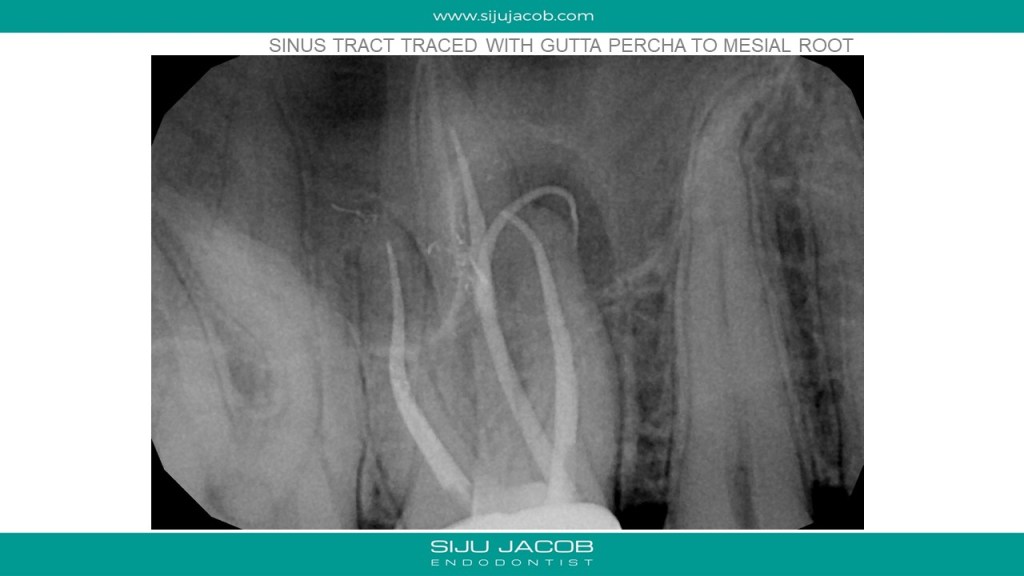 Re-treatment due to missed Mb2 is probably the most commonly referred procedure that I do. And almost every time, I leave the other canals alone. in this case, the referral did endo and placed a new crown, after which the patient had pain followed by a sinus tract. G.p cone tracing of the sinus tract led to the mesial root. We managed to do this with the very conservative opening, thereby preserving the new crown. (in hindsight, i probably should have left the mb1 alone)