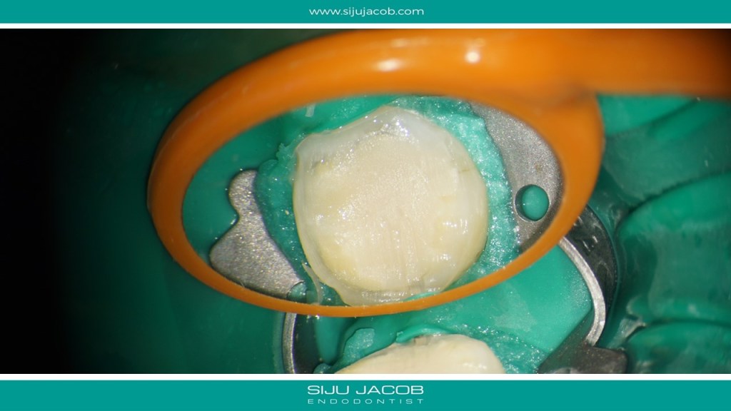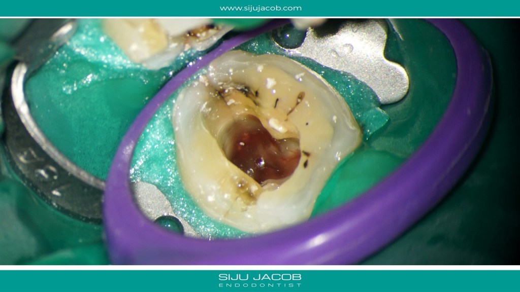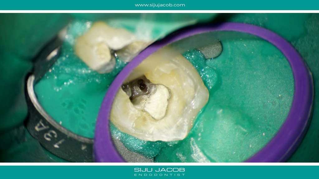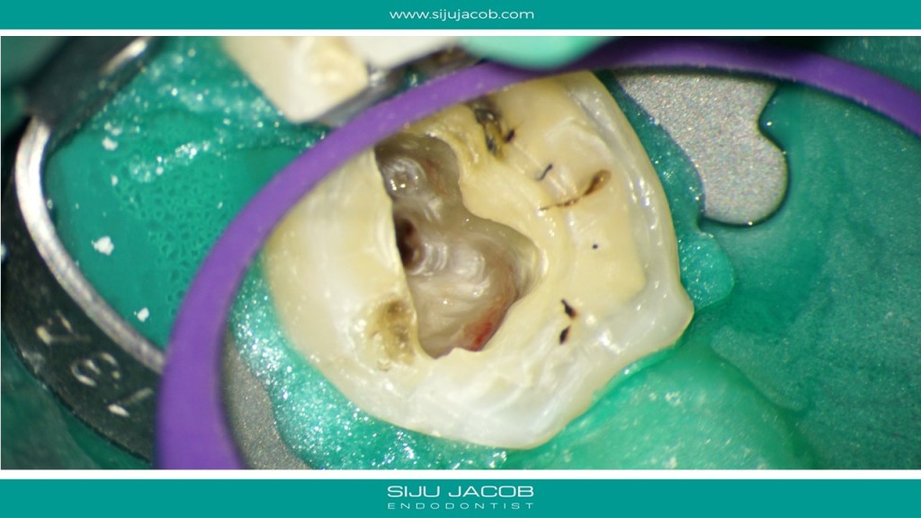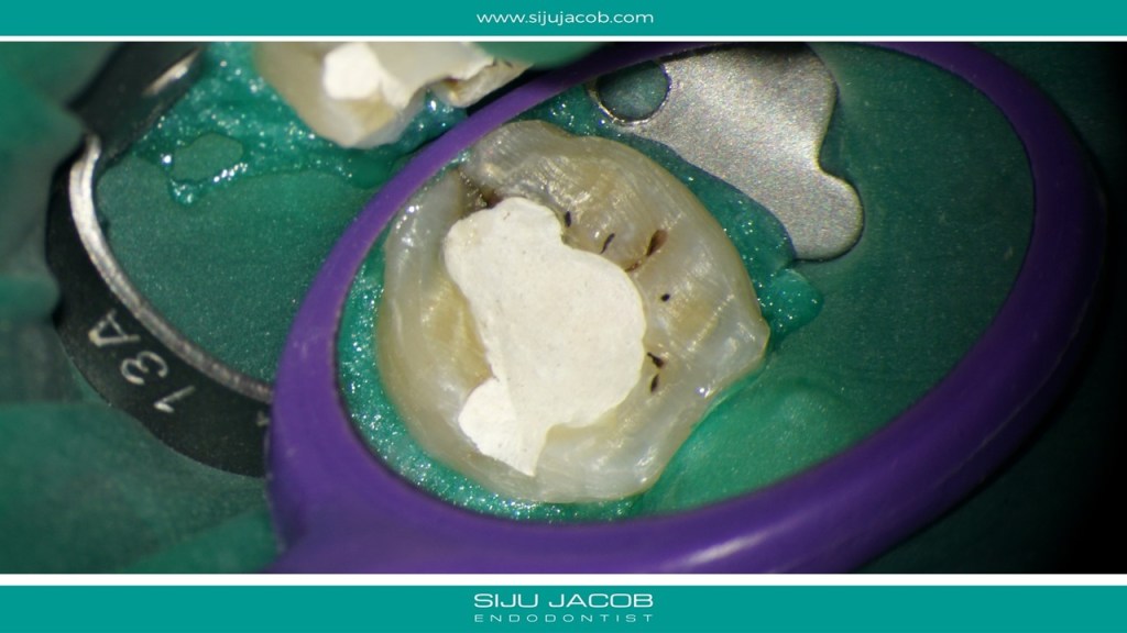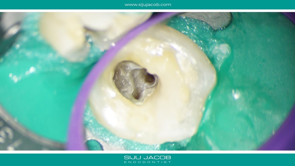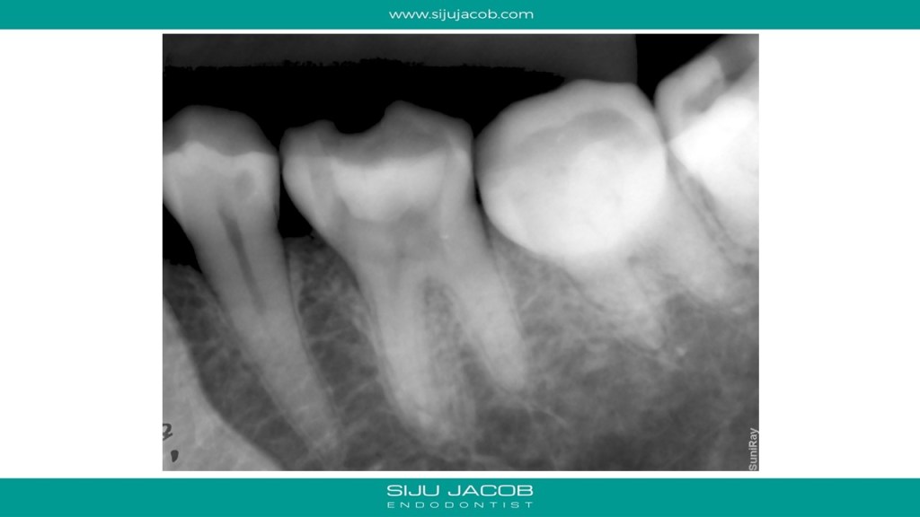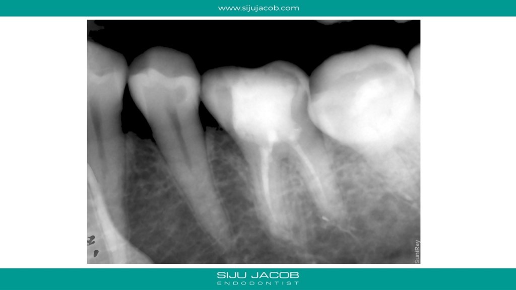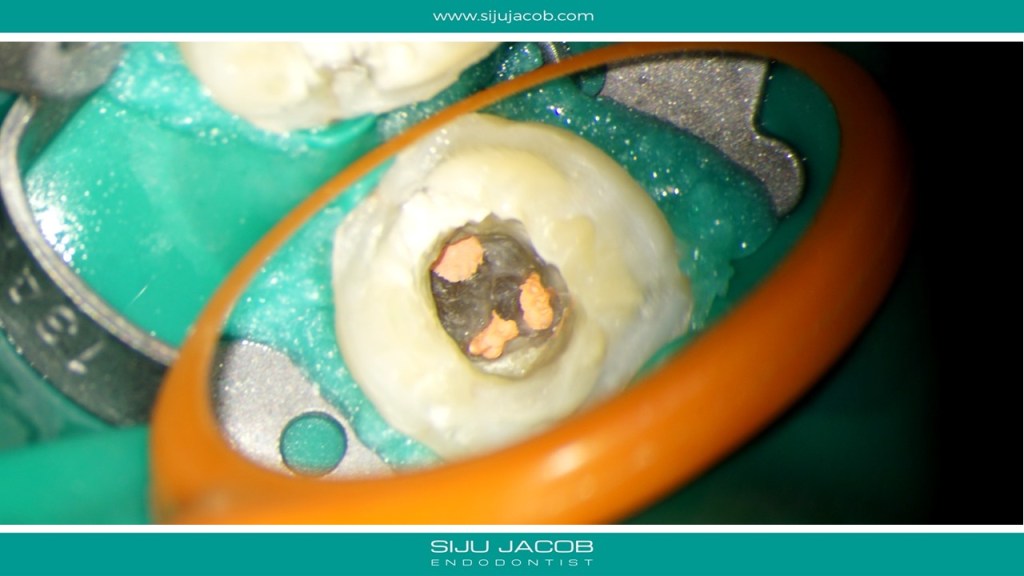 This mandibular molar was previously accessed by an endodontist and then referred. There was a perforation mesially and the canals were located in strange positions. To add to that, the canals were very hard to negotiate and the “feel” was very different to conventional canals. The dentine felt harder than usual. I didn’t want to risk using rotary niti in this case because the feel to rotary too was different when i tried. So, I hand-filed all the canals. Skinny preps in the canal and MTA to seal the Perforation.