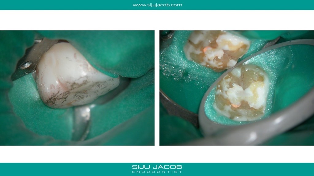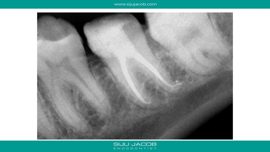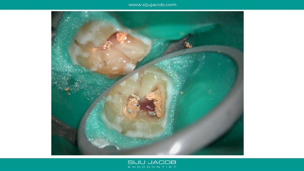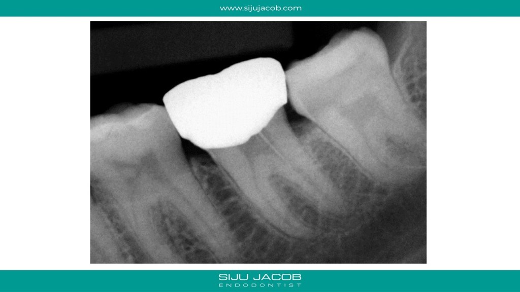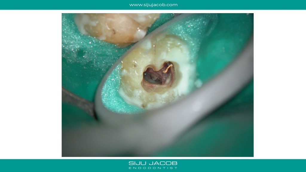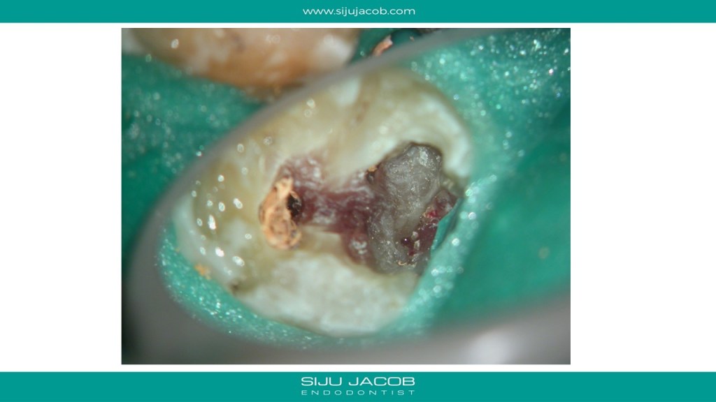 This was a bizarre case. Patient came from another state to Bangalore for a wedding. Came to the clinic with acute pain. She said that she had endo and crown done the previous week. She told me that the doctor who treated her used a microscope and also showed her pictures of three canals filled. I told her that on the radiograph, it looked liked her dentist had attempted to fill one canal. She was quite sure that she saw pictures of three canals filled. I removed the crown, reopened the access cavity and to my surprise found gutta percha mesially. It was in the periodontal ligament!