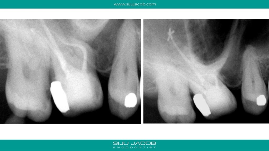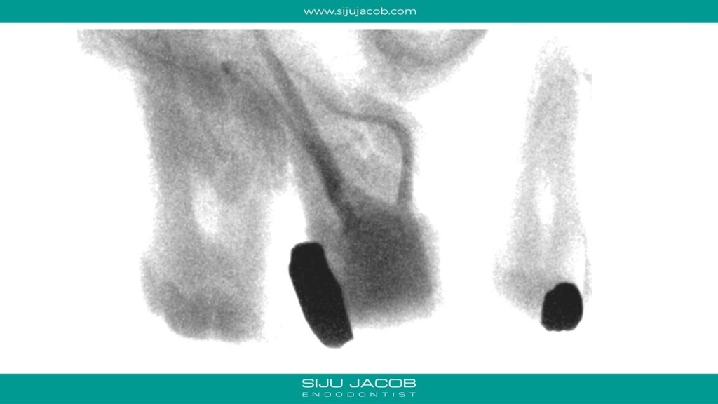The Mesio-buccal canal in this tooth was probably the most curved canal I ever treated. It went straight initially, then took a left turn, then a right, then a left again to exit. And to add to the Drama, it was before Christmas holidays and the palatal root ended up with sealer pushed apically in the shape of a proper Christmas Star. Bizarre! π