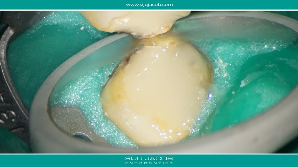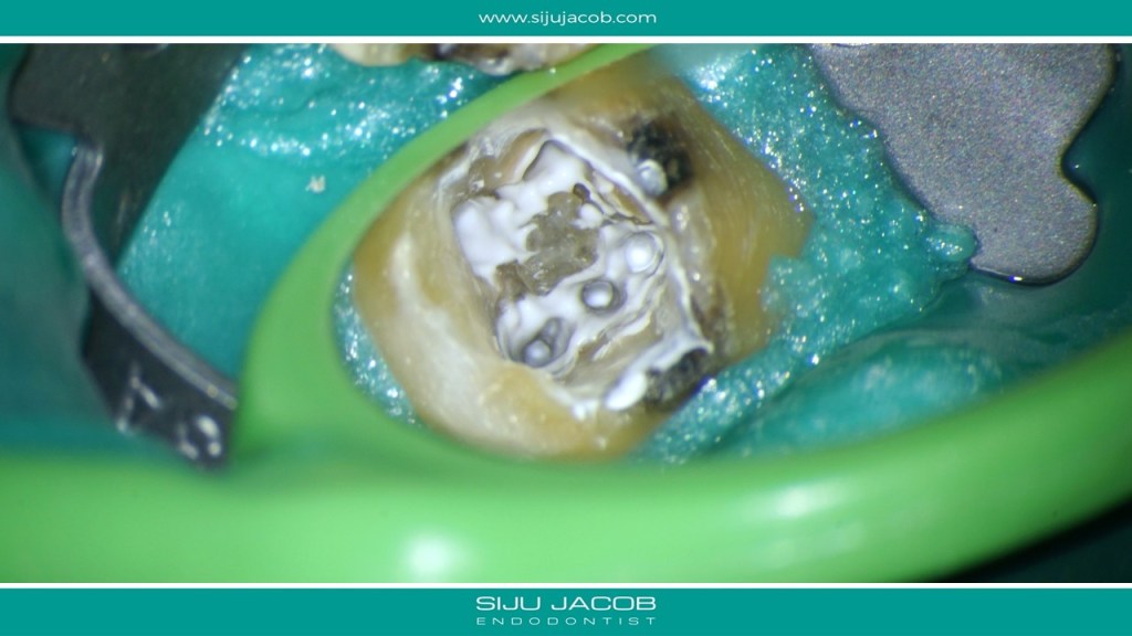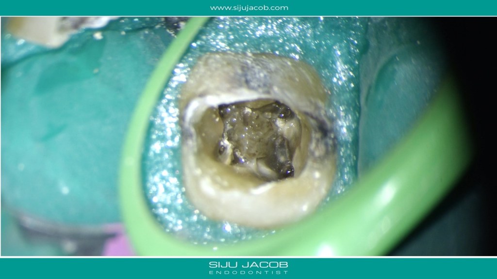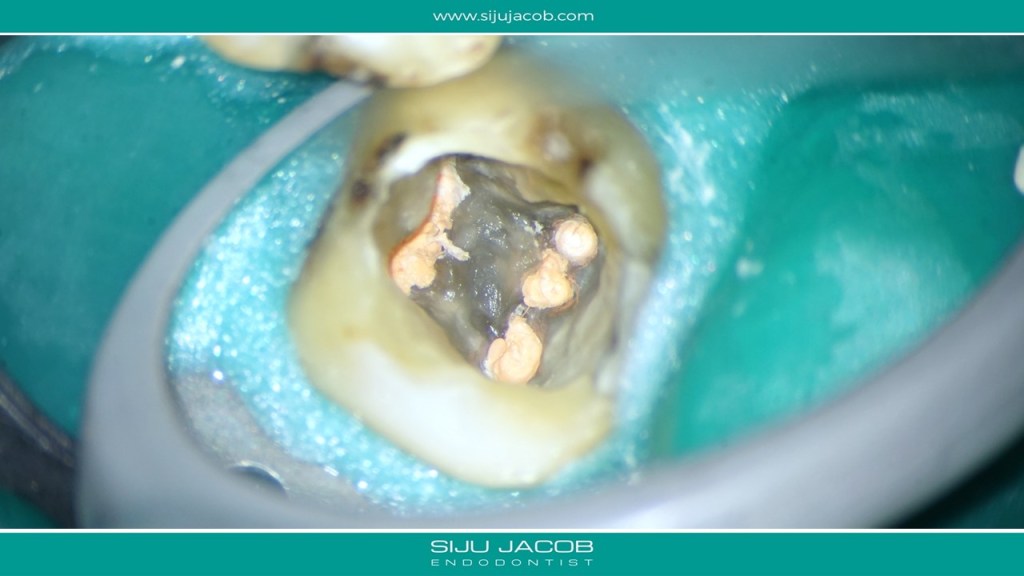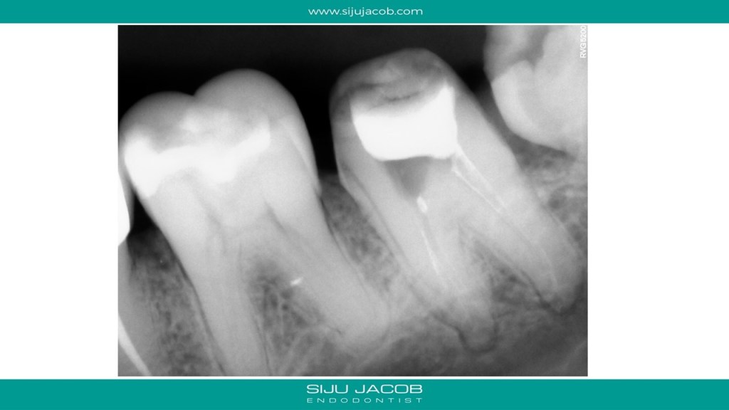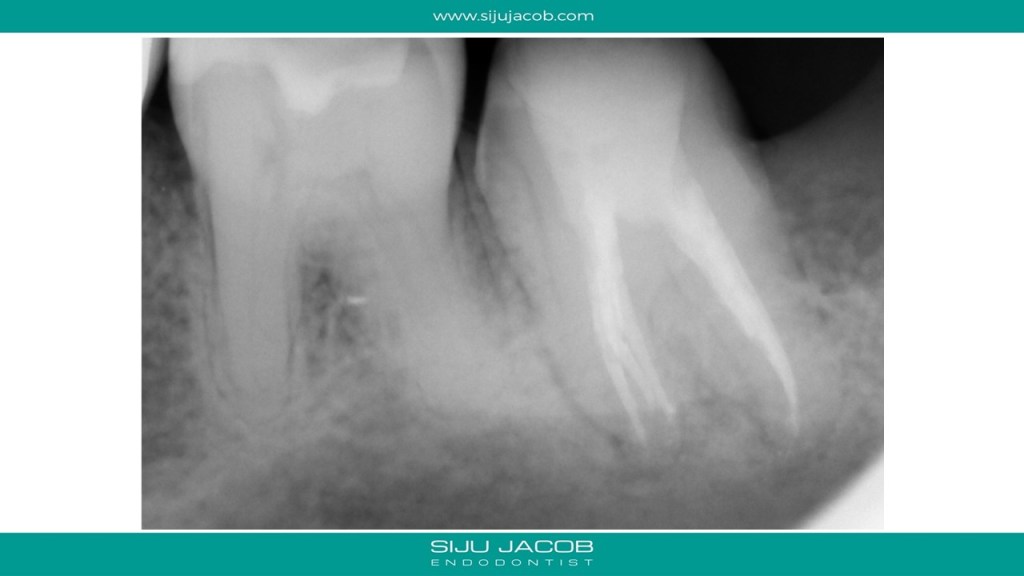 This patient had pain after endo and crown on a mandibular second molar. She went back to the practitioner who removed the crown and removed the old gutta percha. The tooth subsequently flared up and she landed in my office. I found a missed middle mesial. We put the tooth on long-term calcium hydroxide intra canal medication, extracted the wisdom tooth and waited for the tenderness to subside before obturation . Pictures are self-explanatory